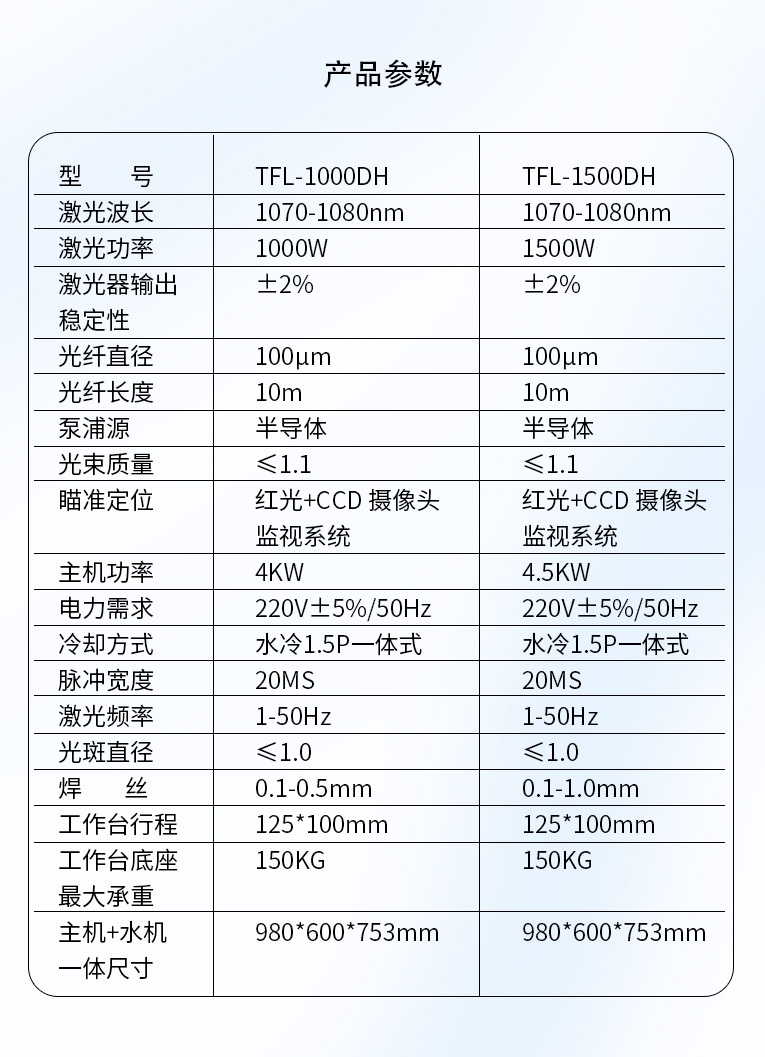 采用光纖激光器,反射率高,能量強,免維護,免調光,功耗少,相比傳統 模具焊來說,體積小,安全,穩定性好超長使用壽命。 1000W光纖激光器,滿足銅、鋁焊接量大的模具及產品焊接加工需要。 高承重底座及工作臺,保持輕便靈活的優點,同時提供更高承載能力。 配備.1.5P大功率一體式水冷水機,保證了大功率焊接的穩定性。