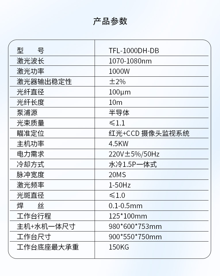采用光纖激光器,反射率高,能量強,免維護(hù),免調(diào)光,功耗少,相比傳統(tǒng) 模具焊來說,體積小,安全,穩(wěn)定性好超長使用壽命。 1000W光纖激光器,滿足銅、鋁焊接量大的模具及產(chǎn)品焊接加工需要。 高承重底座及工作臺,保持輕便靈活的優(yōu)點,同時提供更高承載能力。 配備.1.5P大功率一體式水冷水機(jī),保證了大功率焊接的穩(wěn)定性。